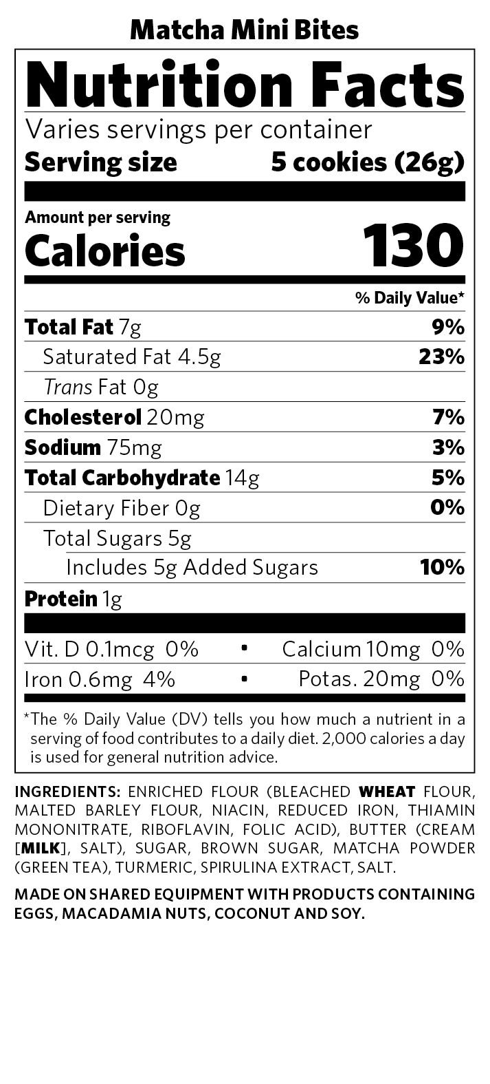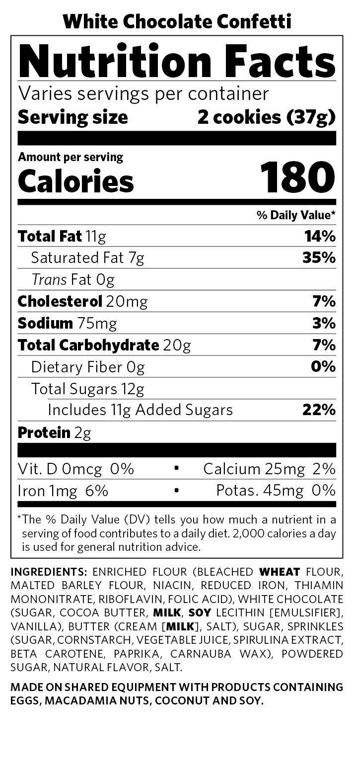 All cookies are made on shared equipment with products containing eggs, macadamia nuts, coconut and soy.